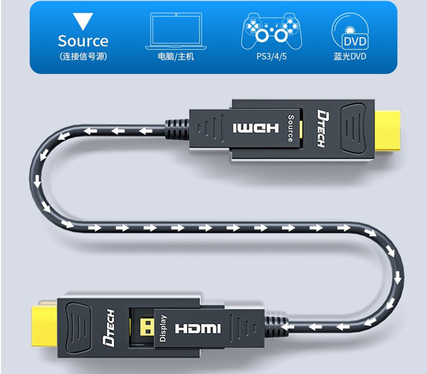 3、选用光纤HDMI线,一定要注意好方向,source信号端是插信号源,display显示端呢则是插一些显示设备,单向运输,安装的时候一定要提醒好师傅千万不要接反了。